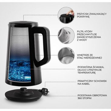 Air Essence LuminaTi PRO je rychlovarná konvice s působivým výkonem 1500 W, který zaručuje okamžitý ohřev vody. Díky tomu nemusíte na svůj oblíbený čaj nebo kávu dlouho čekat – konvice LuminaTi dodává vroucí vodu expresní rychlostí.